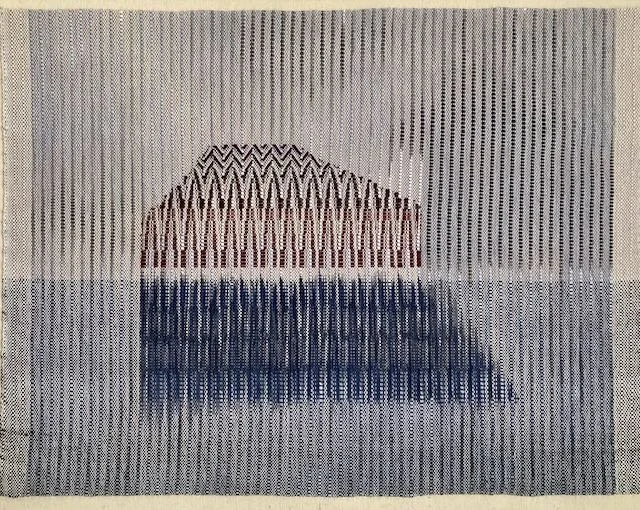 In my new woven work, I’m exploring the structure of weaving and returning to clouds and shorelines. Playing with print registration (stencil painted warp). stripes, and twill. Thinking about cross-hatching, colour theory, and light/dimension.
