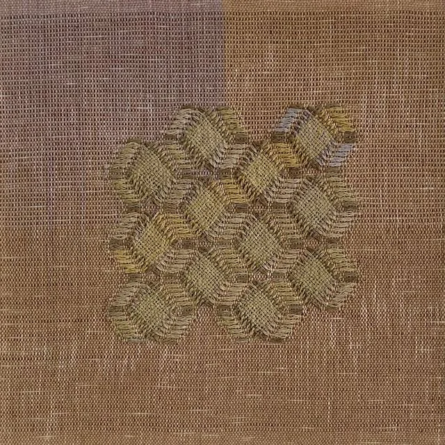 A weaving within a weaving. Various textile processes and techniques build rich colours, textures, and structural layers. Using supplementary weft brocade, secondary woven structures are created while on the loom. All warp and weft yarns (cotton and linen) are dyed before weaving, using local plant colour foraged from my immediate environment such as goldenrod, apple tree bark, and butternuts; as well as natural dyes from further afield.
